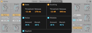 (Beat Repeat入力で受信する)オリジナル信号は、Beat Repeatで作成されるリピートとミックスされます。 ミックスモードは、オリジナル信号がデバイスを通過しそこにリピートが加わる[Mix]、リピート再生中にはオリジナル信号が無音化されるが、それ以外の時は信号が通過する[Insert]、リピートのみが通過する[Gate]の3つから1つを選択できます。 [Gate]モードは、リターントラックにエフェクトが置かれている場合に特に便利です。