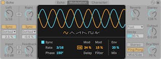 LFOは2つとも同じ周波数で動作しますが、[Phase]コントロールは、2つの波形を相対的に補正(オフセット)することで、サウンドステレオの動きに役立ちます。 180に設定すると、LFOの位相が不一致になる(180度離れる)ので、一方のLFOがピークに達すると、もう一方はレベルが最低になります。 [Phase]は、ビブラートエフェクトを生じさせる効果もあります。