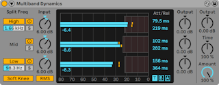 スタジオでは、1つのキャビネットに対して複数のマイクを使用し、ミキシング中にそのバランスを調整するのが一般的です。 この操作は、Liveのオーディオエフェクトラック(「インストゥルメント、ドラム、エフェクトのラック」参照)を使用することで簡単に行えます。 次の手順をお試しください。