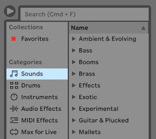 Live’s browser (see ‘Working with the Browser’) is the place where you interact with your library of musical assets: the core library of sounds that are installed with the program, any additional sounds you’ve installed via Ableton Packs, presets and samples you’ve saved, your Ableton and third-party devices, and any folders that you’ve added manually.