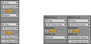 Likewise, a track can be set up to receive an input signal to be played through the track’s devices. Again, tracks can receive their input from the outside or from another track or device in Live. The Monitor controls regulate the conditions under which the input signal is heard through the track.