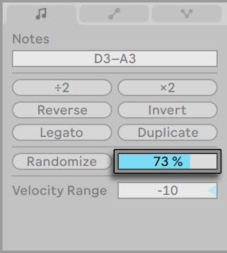 For example, if a velocity range of +20 is set for a selected note with a velocity value of 60, a random value between 60 and 80 will be chosen each time the note is played. A velocity range can also be applied to the entire clip if no specific notes are selected.
