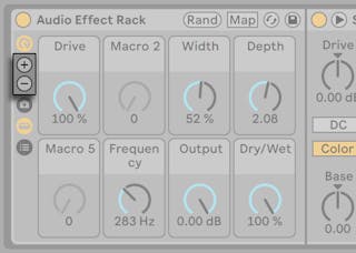 You can store different states of Macro Controls as individual presets (or “variations”). This is useful when, for example, you want to capture the state of a Rack as a “snapshot” during a sound design session, or audition different settings of a mapped Macro Control in an Audio Effect Rack made for mixing. You can also use these variations or create builds and drops, or make instant jumps between different Macro Control settings while recording or performing.