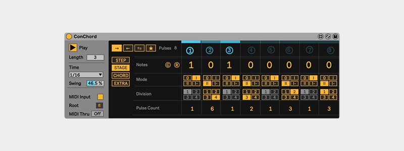 ConChord ist ein Puls-basierter Akkord-Step-Sequenzer für raffinierte rhythmische und melodische Pattern. Neben den klassischen Parametern Time, Swing und Spielrichtung gibt es für jeden Step einen variablen Puls-Wert – für Pausen und Wiederholungen. Außerdem kann jeder Step einen Akkord erzeugen, was dem Sequenzer zusätzliche Musikalität verleiht.